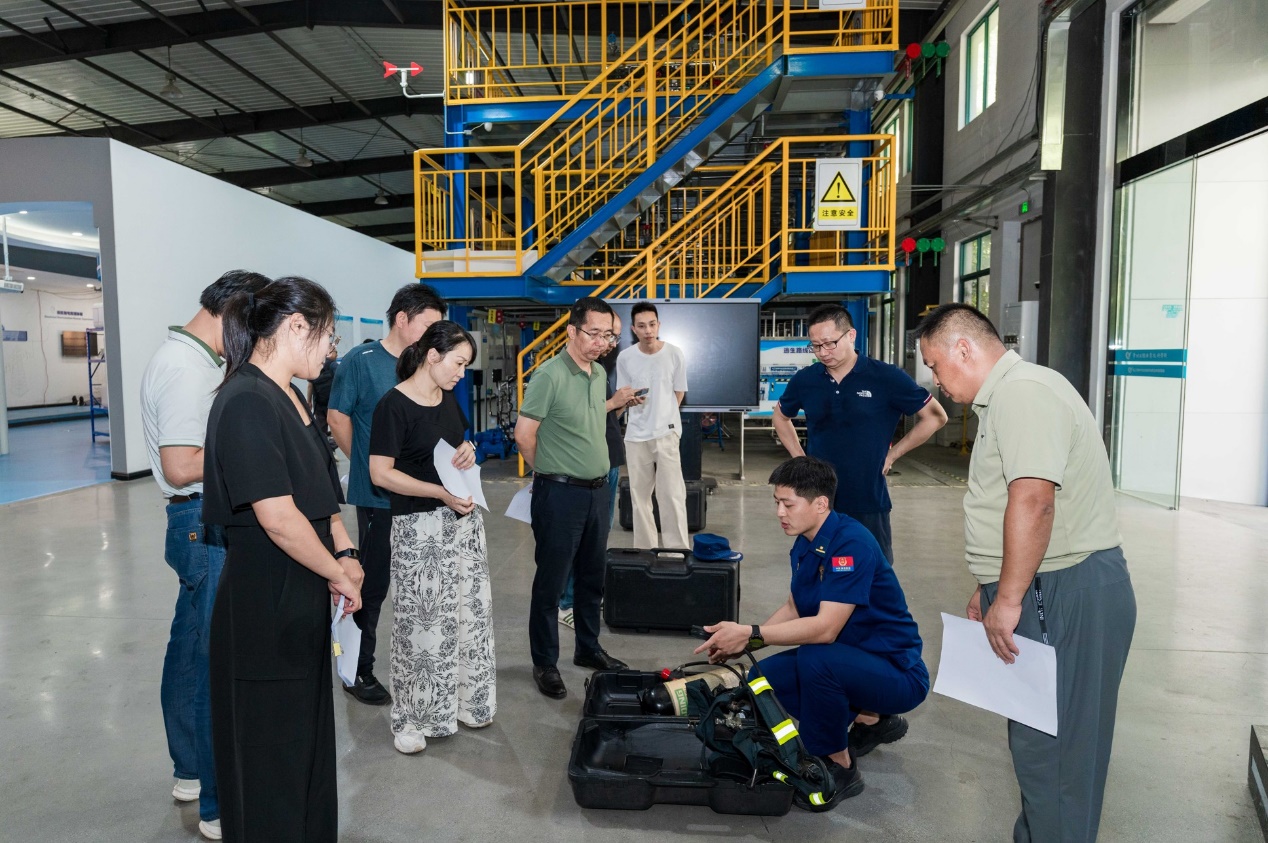 技能竞赛在我校与滨开区共建的化工特种作业实训基地进行,分为理论和实操两个模块。理论考核聚焦安全生产和劳动保护技能,实操考核通过正压式空气呼吸器佩戴、3D仿真模拟小型泄漏、着火场景应急处置等多个项目,全面检验选手的综合能力。