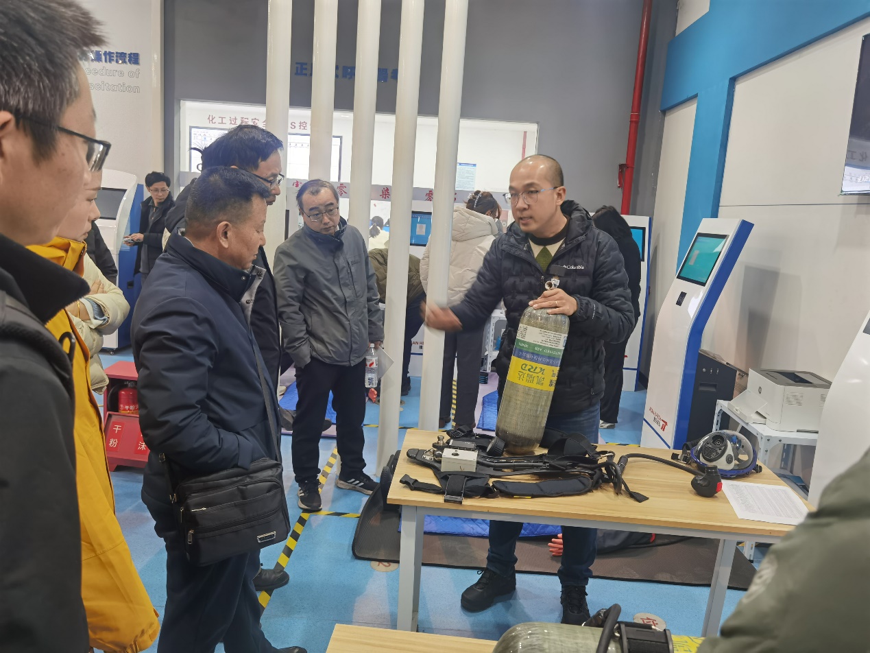 本次培训课程设计科学系统,突出理论与实践紧密结合。上午的理论课程在合一楼中503教室进行,由学院副教授陈川主讲,通过对国内外典型危险化学品事故的深入剖析,强化学员的安全意识与法规理解。下午的实操培训移至科教城东区特种作业实训基地进行。学员分为四个小组,在乔奇伟、程雅菊、周鹏鹏、刘懿老师的指导下,依次分组进行“正压式空呼使用训练”、“心肺复苏技能训练”、“高危工艺模拟实训”及“作业现场应急处置实训”四大模块的强化训练。这种小班化、轮动式的实操安排,有效利用了学院先进的实训设备,确保了每位学员都能获得充分、规范的动手操作机会,切实提升在紧急情况下的个人防护与应急处置实战能力。